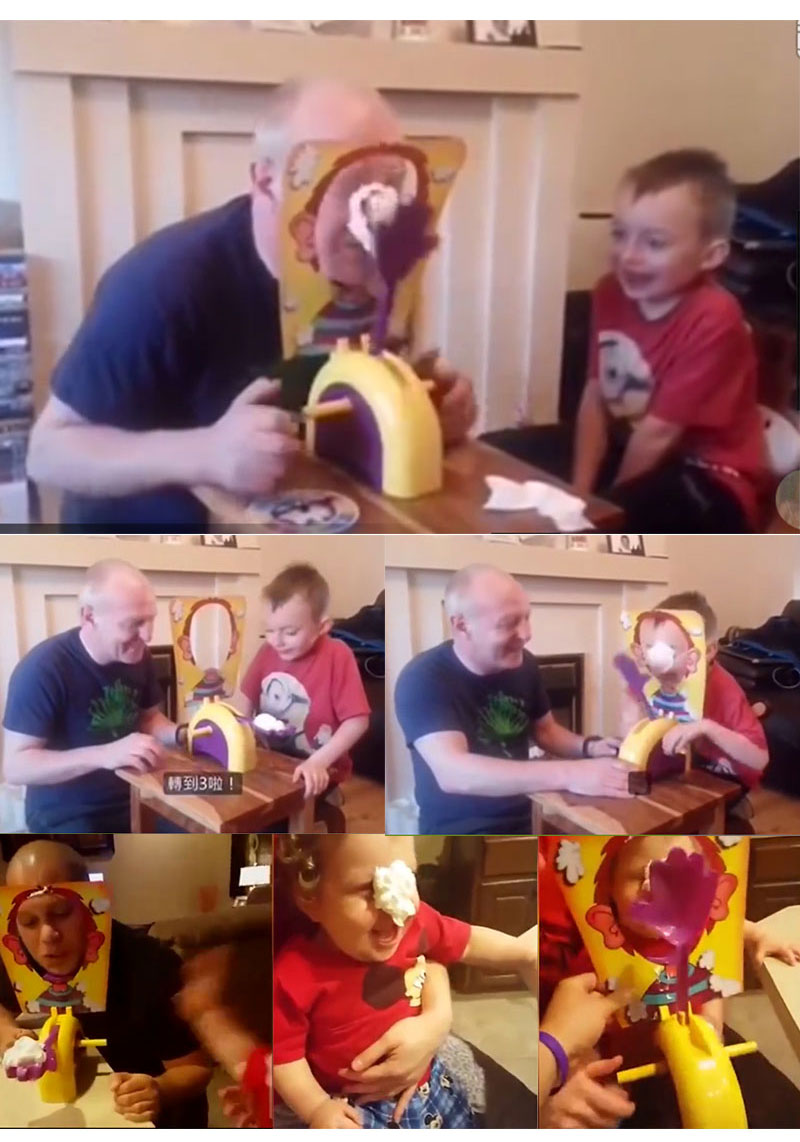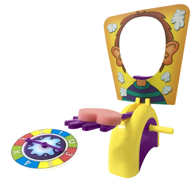 Note:To avoid injury, please follow the assembly instructions carefully. SET-UP 1.Insert the mask on the thrower, between the chin rest slot and retaining clips at the front. 2.Push the chin rest into the slot on the thrower, allowing it to further secure the mask in place. Be careful not to bend the mask. 3.Gently push the handles into place on both sides of the thrower. Make sure the slots. Correspond accordingly. 4.Push the throwing arm into the slot on the triggering mechanism without turning the handles. 5.Put the thrower on a suitable playing surface. 6.Set the throwing arm by pressing it down into place. 7.Put the spinner nearby. 8.Load the ‘hand’ with lots of delicious squirty cream from home! Fantastically exciting and fun-filled. Load the arm and wait for the tension to build. Package Include:Throwing arm x 1 handles x 2 chin rest x1 splash card mask x1 spinner x1 sponge x1